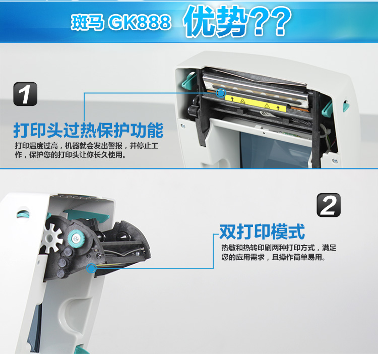 GK888打印机采用了小巧、节省空间的设计,使用强大的32位处理器,可快速打印标签,还具备大容量内存,可实现更多的图片存储、更长(991毫米)的标签格式以及更快的处理速度。GK888支持标准桌面应用的108毫米介质宽度。它还支持EPLT"'和强大的ZPL@编程语言一能够更便捷地与其他Zebra打印机集成一而三种接口和10/100以太网选件则可提供较大的系统集成灵活性。剥离器/分配器和切纸器选件扩展了GK888打印机功能的多样性,可满足更多不同类型打印应用的要求。